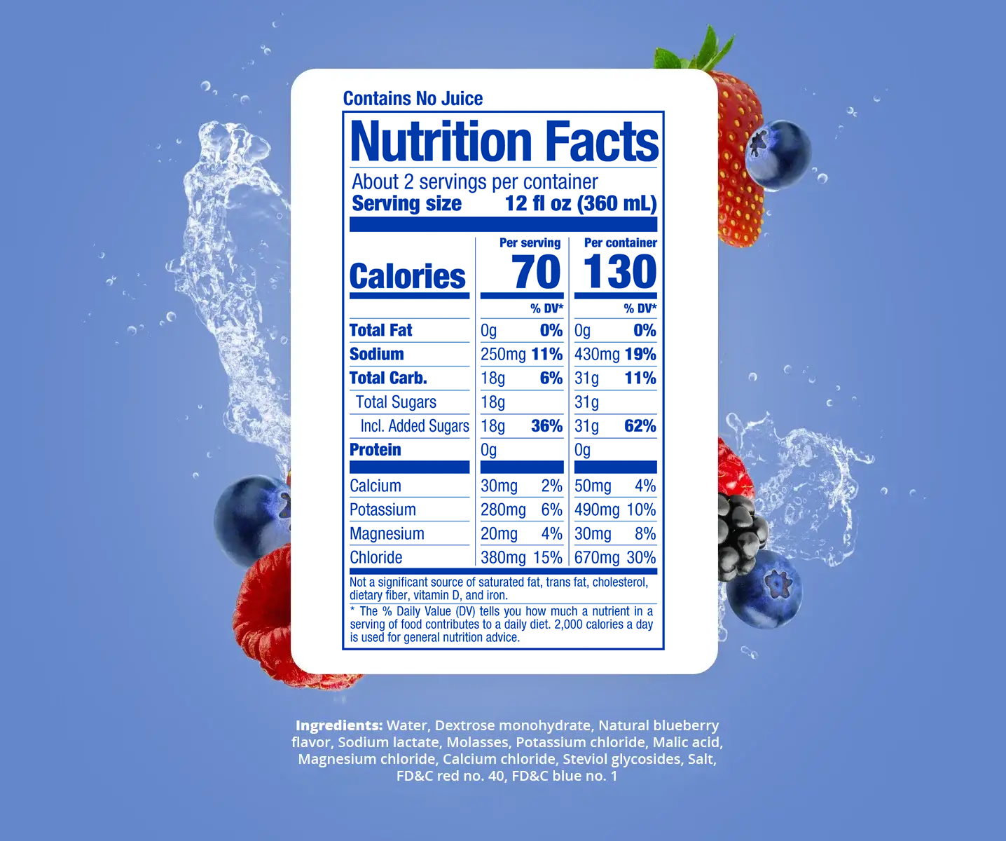 Ingredients: Water, Dextrose Monohydrate, Natural Berry Flavor, Sodium Lactate, Citric Acid, Potassium Chloride, Malic Acid, Molasses, Magnesium Chloride, Calcium Chloride, Salt, Steviol Glycosides, Sucralose, Glycerol Ester of Wood Rosin, FD&C Blue No. 1, Sucrose Acetate Isobutyrate.