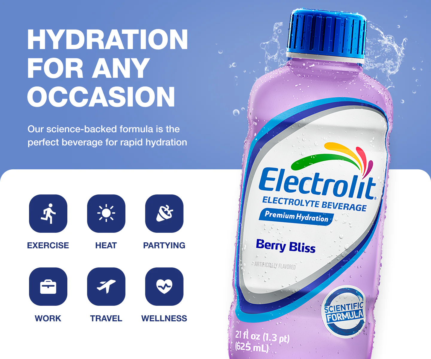 Instant Hydration: whether at the beach, after happy hour, or post-pilates, Electrolit provides quick, convenient hydration.