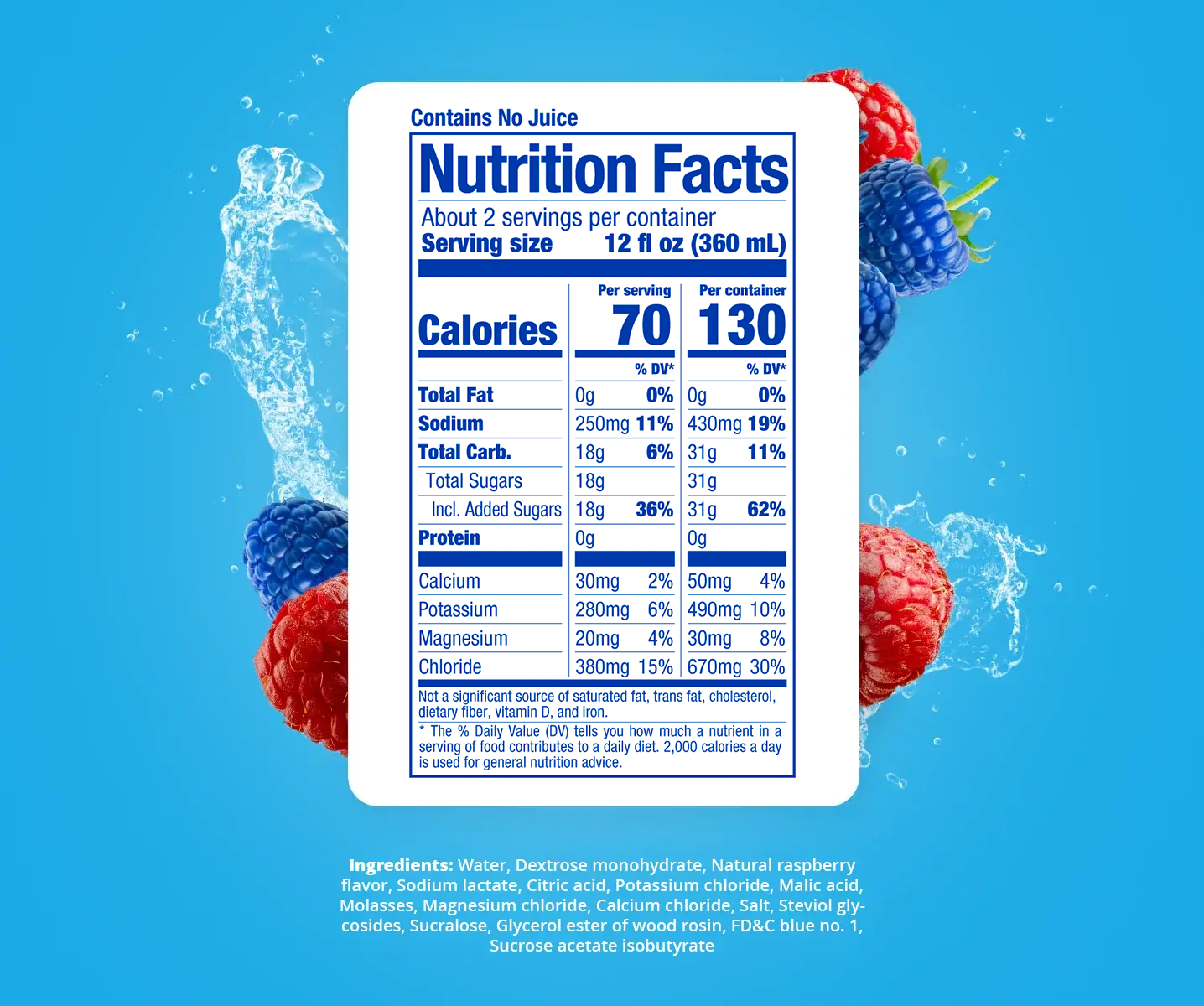 Ingredients: Water, Dextrose Monohydrate, Natural Raspberry Flavor, Sodium Lactate, Citric Acid, Potassium Chloride, Malic Acid, Molasses, Magnesium Chloride, Calcium Chloride, Salt, Steviol Glycosides, Sucralose, Glycerol Ester of Wood Rosin, FD&C Blue No. 1, Sucrose Acetate Isobutyrate.