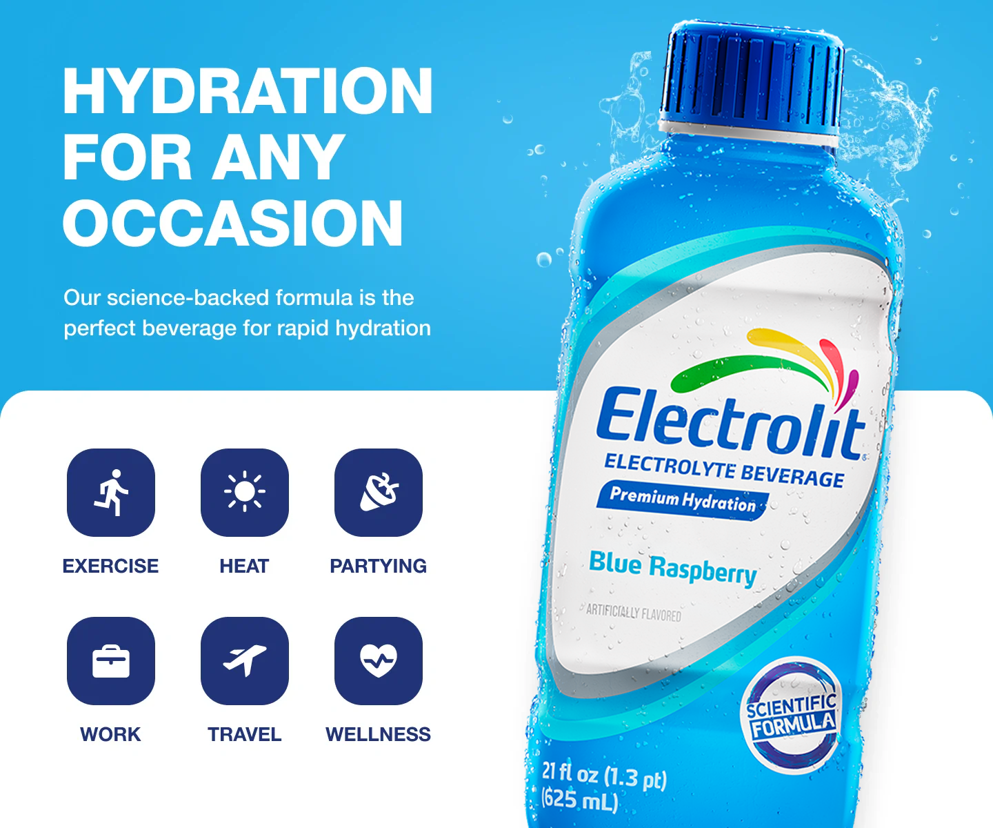 Instant Hydration: whether at the beach, after happy hour, or post-pilates, Electrolit provides quick, convenient hydration.