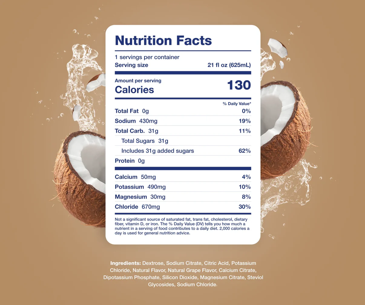 Ingredients: Water, Dextrose Monohydrate, Natural Coconut Flavor, Sodium Lactate, Citric Acid, Potassium Chloride, Malic Acid, Molasses, Magnesium Chloride, Calcium Chloride, Salt, Steviol Glycosides, Sucralose, Glycerol Ester of Wood Rosin, Sucrose Acetate Isobutyrate.