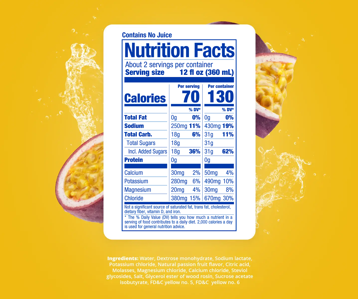 Ingredients: Water, Dextrose Monohydrate, Natural Passion Fruit Flavor, Sodium Lactate, Citric Acid, Potassium Chloride, Malic Acid, Molasses, Magnesium Chloride, Calcium Chloride, Salt, Steviol Glycosides, Sucralose, Glycerol Ester of Wood Rosin, FD&C Blue No. 1, Sucrose Acetate Isobutyrate.